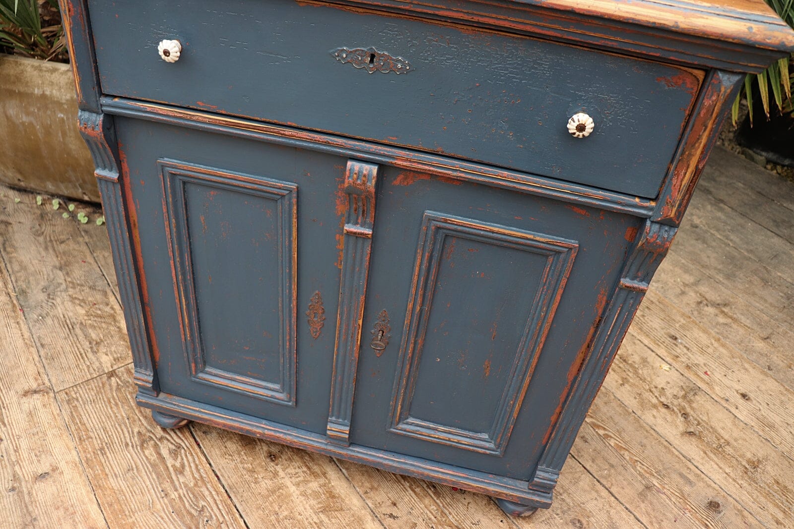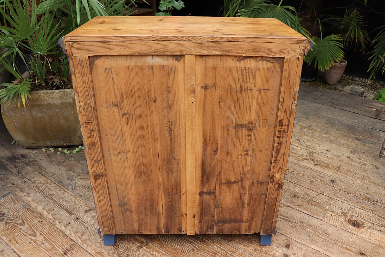 Enough charm for the old pine fans - minor battle scars, old worm 'character' (long dead and dealt with during stripping and not really anything but it is old pine) etc. etc. Original door bolts, replacement lock and key. Ready for immediate use with a good running drawer and smoothly closing doors, combined with an all round sturdy feel. Fabulous! 😀
